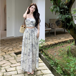 Set Áo Hai Dây Họa Tiết Tranh Sơn Dầu + Chân Váy Dài Lưng Cao Thời Trang Hàn Quốc Quyến Rũ Cho Nữ