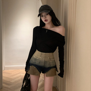 Set Áo Thun Dài Tay Cổ Chữ V + Chân Váy Jeans Lưng Cao Thời Trang Hàn Cho Nữ