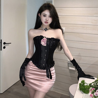 Bộ Áo Ống Ren Hoa Hồng Cổ Yếm + Chân Váy Hồng Lưng Cao Thời Trang Hàn Quốc Quyến Rũ Cho Nữ
