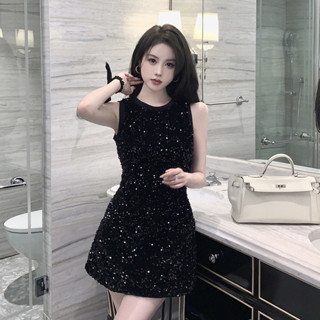 Đầm Đen Không Tay Cổ Tròn Ôm Dáng Đính Kim Sa Lấp Lánh Thời Trang Hàn Quốc Cho Nữ