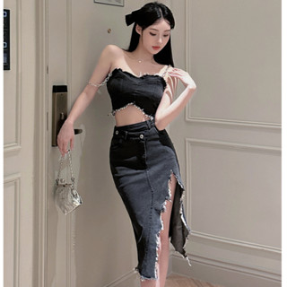Set Áo Denim Hai Dây + Chân Váy Denim Dài Lưng Cao Xẻ Tà Phong Cách Hàn Quốc Quyến Rũ Dành Cho Nữ