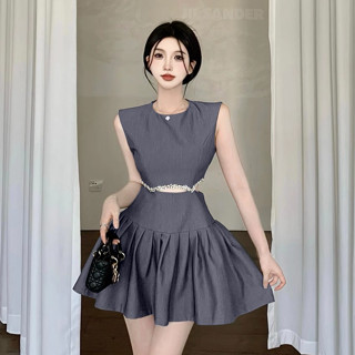 Đầm Không Tay Dáng Ôm Đính Kim Sa Thắt Nơ Eo Phong Cách Hàn Quốc Cho Nữ