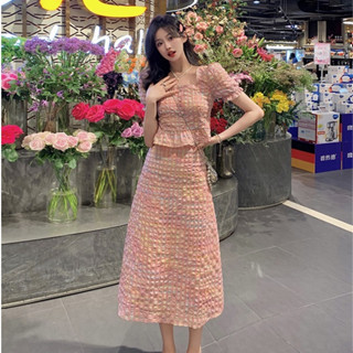 Bộ Áo Ống Ngắn Ôm Dáng + Chân Váy Ngắn Lưng Cao Xẻ Tà Thời Trang Hàn Quốc Thiết Kế Hoa Hồng Trang Trí Công Nghiệp Nặng Cho Nữ