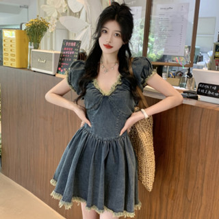 Đầm Denim Ngắn Tay Cổ Chữ V Phong Cách Hàn Quốc Dành Cho Nữ