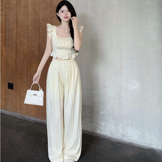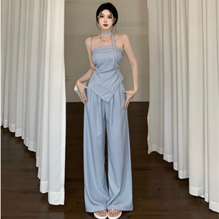 Set Áo Hai Dây Cổ Tròn + Quần Dài Lưng Cao Ống Rộng Thời Trang Nữ