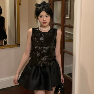Bộ Áo Không Tay Đính Kim Sa + Chân Váy Chữ A Lưng Cao Thời Trang Hàn Quốc Quyến Rũ Cho Nữ