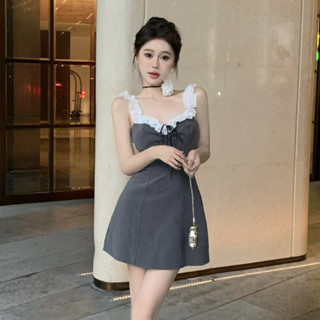 Đầm Hai Dây Ôm Dáng Eo Cao Viền Ren Màu Xám Gợi Cảm Thời Trang Hàn Quốc Cho Nữ
