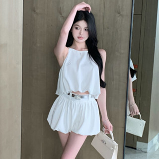 Set Áo Chiffon Sát Nách Cổ Tròn Đính Đá + Quần Short Lưng Cao Ống Rộng Thời Trang Hàn Quốc Cho Nữ