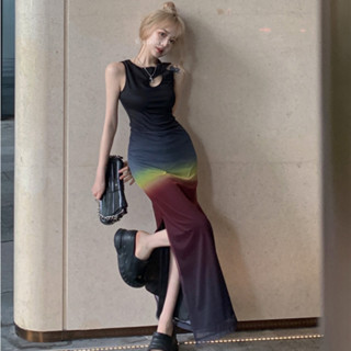 Đầm Dài Không Tay Cổ Tròn Ôm Dáng Họa Tiết Cầu Vồng Thời Trang Hàn Quốc Cho Nữ