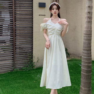 Đầm Dài Cổ Yếm Tay Phồng Ôm Eo Thời Trang Pháp Quyến Rũ Cho Nữ
