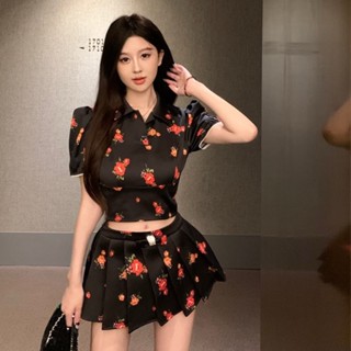 Set Áo Tay Ngắn Phồng + Chân Váy Xếp Ly Lưng Cao Thời Trang Hàn Quốc Cho Nữ