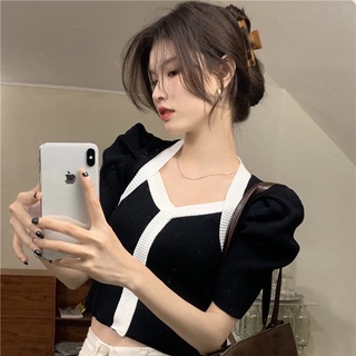 Áo Dệt Kim Nữ Màu Đen Đỏ Trắng Xanh Chất Len Mongtoghi Ngắn Tay Cổ Tim Tay Bồng Tiểu Thư Viền Phối Màu Style Hàn Quốci