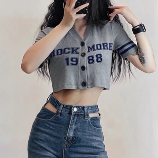 Áo Croptop Nữ Cổ V Màu Ghi Xám Số 1988 Cài Cúc Ngắn Tay Chất Tổ Ong Co Dãn Nhẹ Loại 1 Style Hàn Quốc Năng Động Cá Tính
