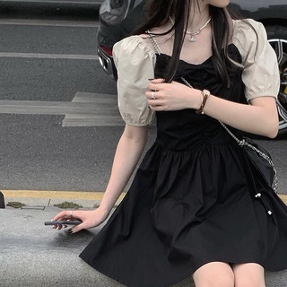Đầm Đen Tay Phồng Cổ Vuông Phối Ren Thời Trang Mùa Hè Pháp 2022 Cho Nữ