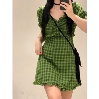 Đầm Họa Tiết Sọc Caro Màu Xanh Lá Cây Phong Cách Pháp Thời Trang Mùa Hè Mới