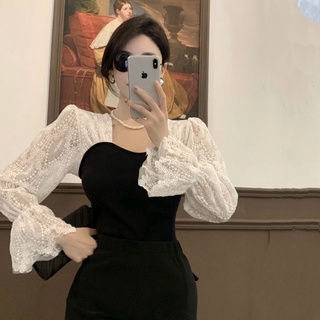 Đầm dệt kim cổ vuông tay phồng phối ren ngọt ngào kiểu pháp cho nữ