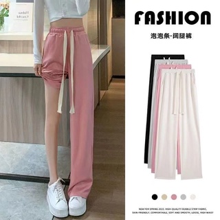 Quần Dài Thể Thao Lưng Cao Ống Rộng Màu Đen Phối Dây Rút Thời Trang Năng Động Cho Nữ