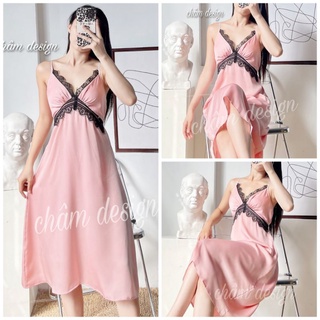 váy ngủ lụa satin 2 dây dáng dài màu da hồng pha ren da cùng màu, hàng thiết kế và may thủ công tại shop