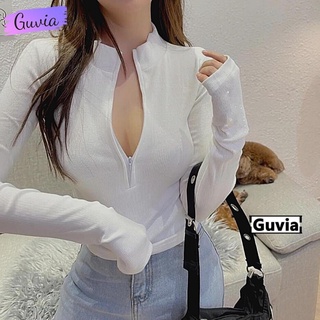 Áo Croptop Tay Dài CỔ CAO DÂY KÉO Thun Gân Ôm Body Sexy Ulzzang GUVIA