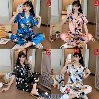 Bộ Đồ Ngủ Lụa Bóng Ngắn Tay In Họa Tiết Hoạt Hình Cho Nữ