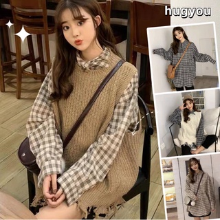 Bộ áo sơ mi tay dài kẻ sọc + áo khoác len không tay phong cách Hàn Quốc hợp thời trang cho nữ