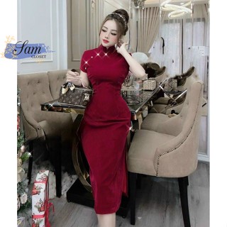 [HCM] Sườn Xám Cổ Tàu Đính Cườm Chất Liệu Nhung Thời Trang Nữ Sam Closet Free Size 40-55kg