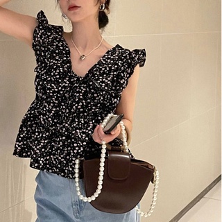 Áo Sơ Mi Không Tay Viền Nhún Bèo Họa Tiết Hoa Phong Cách Hàn Quốc