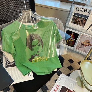 Áo Thun Tay Ngắn Hở Vai In Họa Tiết Màu Xanh Lá Thời Trang Mùa Hè Cho Nữ