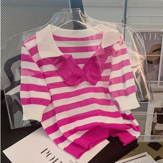 Áo polo Dệt Kim Cổ Bẻ Họa Tiết Kẻ Sọc Thời Trang Mùa Hè Phong Cách Hàn Quốc Mới Cho Nữ