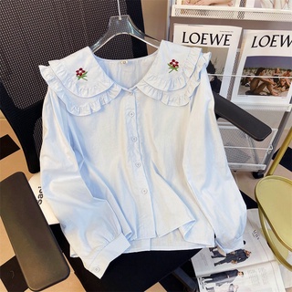 Áo Sơ Mi Tay Dài Dáng Rộng Cài Khuy Cổ Búp Bê Thêu Họa Tiết Màu Trơn Thoải Mái Thời