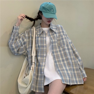 Áo Sơ Mi Caro Tay Dài Dáng Rộng Phong Cách Hàn Quốc Cho Nữ