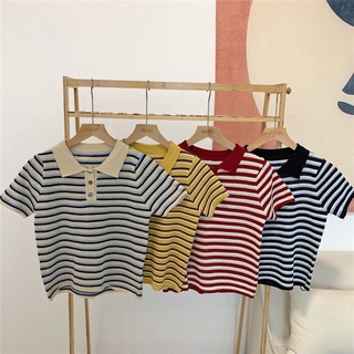 Áo Sweater Tay Ngắn Cổ Polo Hoạ Tiết Kẻ Sọc Thời Trang Mùa Hè Dành Cho Nữ