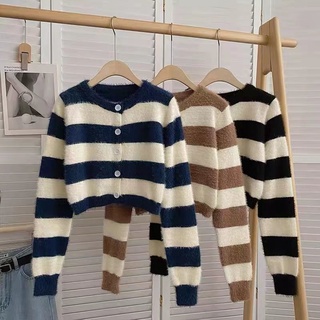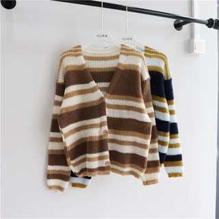 Áo Dệt Kim Ngắn Dáng Rộng Kẻ Sọc Màu Sắc Phong Cách Hàn Quốc Cho Nữ