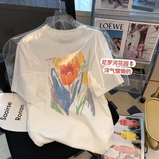 Áo Thun Cotton Tay Ngắn Dáng Rộng In Hình Hoa Tulip Thời Trang Mùa Hè Hàng Mới Dành Cho Bạn Nữ