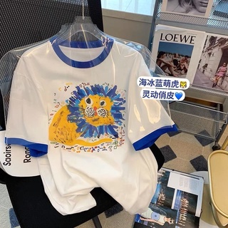 Áo Thun Ngắn Tay In Hoạt Hình Sư Tử Phối Màu Tương Phản Cá Tính Cho Nữ