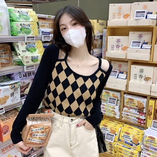 Áo dệt kim trễ vai giả hai lớp họa tiết sọc caro thời trang cho nữ