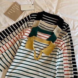 Áo thun cổ bẻ tay dài dáng rộng kẻ sọc ngang phong cách Hàn Quốc cho n
