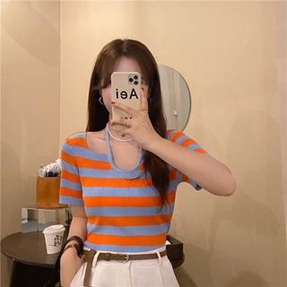 Áo Sweater Dệt Kim Tay Dài Dáng Ngắn Họa Tiết Kẻ Sọc Màu Tương Phản Buộc Dây Thời Trang Mùa Thu