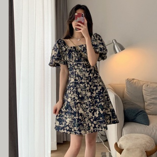 Đầm Tay Phồng Cổ Vuông Họa Tiết Hoa Phong Cách Retro Thời Trang