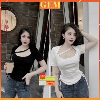 Áo croptop tay ngắn kiểu dây chéo cổ dây rút hông , áo thun nữ thời trang