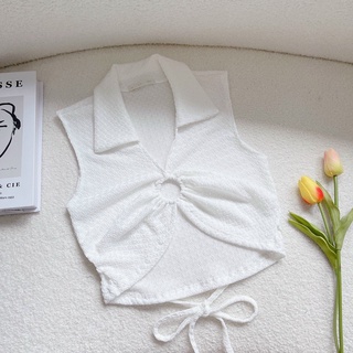 Áo thun croptop ba lỗ cổ bẻ kiểu khoen ngực xinh buộc dây chất thun xốp hột