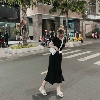 Đầm dài nữ xe tà chất thun dẻo tay ngắn xòe nhẹ cổ tròn hot