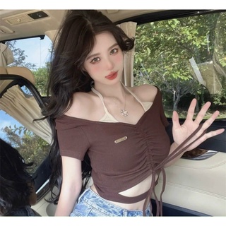Áo thun nữ kiểu croptop tay ngắn rút dây giữa thun gân phối yếm cổ hot