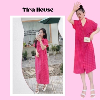 Váy sơ mi hồng họa tiết kẻ caro đỏ dáng suông tay hến gập hot hit, bầu bí bon chen thoải mái