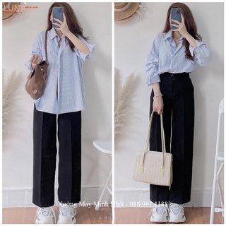 Quần ống rộng lưng cao đi học làm công sở khóa trước màu Đen dáng quần tây ống rộng cạp cao vải tuyết mưa dày dặn mềm
