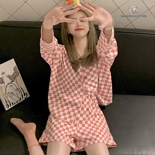 Set đồ ngủ dài tay kẻ sọc caro phong cách Hàn Quốc cho nữ