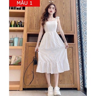 Đầm 2 Dây Thắt Nơ Vai Màu Trắng Bánh Bèo, Maxi Đi Biển Dạo Phố Sang Chảnh Form Chuẩn, ĐẦM TRẮNG 2 DÂY ĐUÔI CÁ
