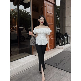 [ ĐANG ƯU ĐÃI ] Áo trễ vai hoa nổi trắng +Quần đen cạp cao xẻ gấu [𝐅𝐑𝐄𝐄𝐒𝐇𝐈𝐏]
