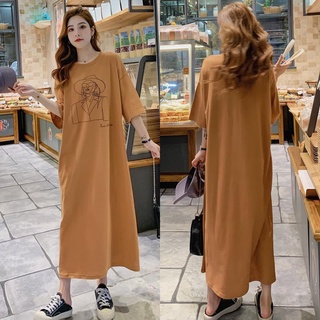 [LININ] Đầm Thun Dài Qua Gối Tay Ngắn Dáng Rộng Xẻ Tà Phong Cách Mới Cho Nữ