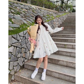 Váy babydoll dài tay dáng xoè nền be hoạ tiết hoa Hải Đường